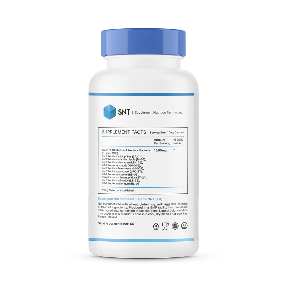 Пробиотическая смесь от SNT содержит 10 активных и клинически изученных штаммов пробиотиков. Исследования подтверждают, что пробиотические штаммы в составе пробиотика SNT чрезвычайно устойчивы к низким уровням pH и воздействию факторов желудочно-кишечного тракта (например, кислоты, желчи, пепсина и панкреатина), а также закрепляются на клеточных линиях кишечника.
